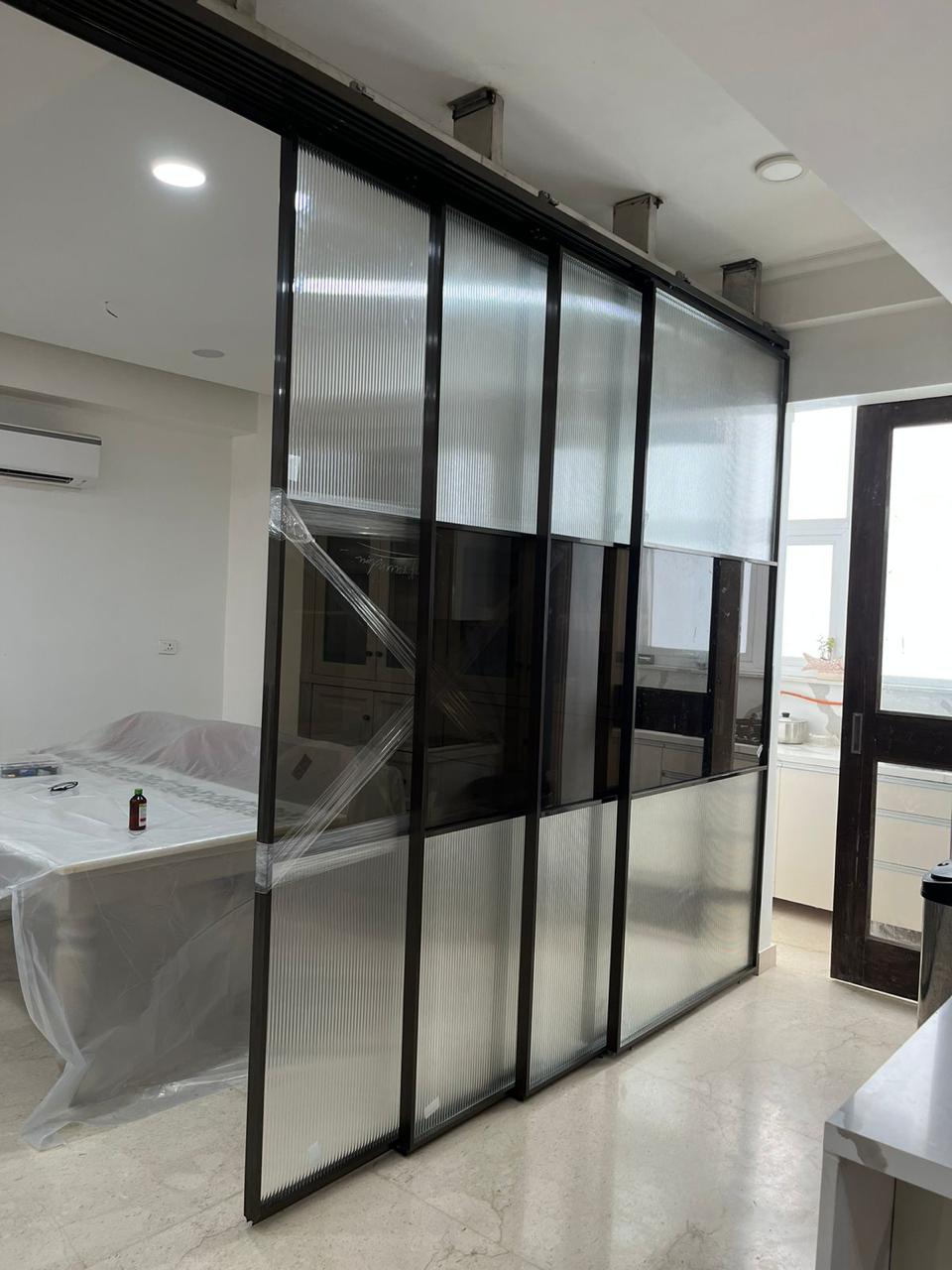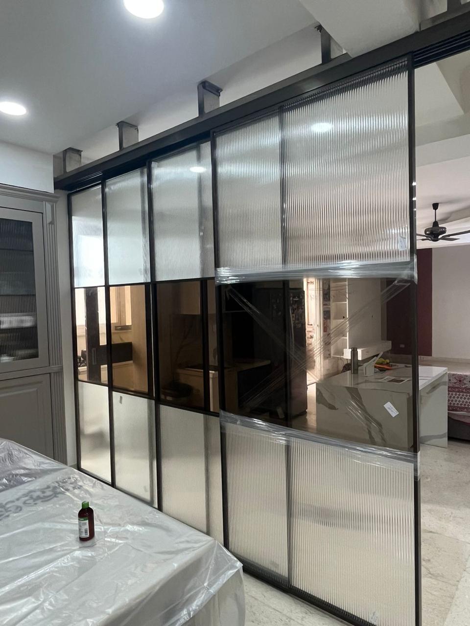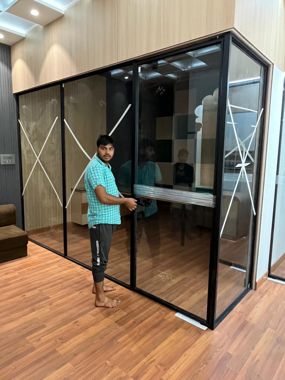 We handle toughened glass work, slim profile and PVD partitions, aluminium fabrication, Aristo wardrobe systems, digital printing glass, mirrors (diamond, framed, and LED), and all types of hardware installation. From small repair jobs to full interior projects, our skilled team ensures precision, safety, and perfect finishing in every task.
